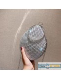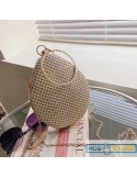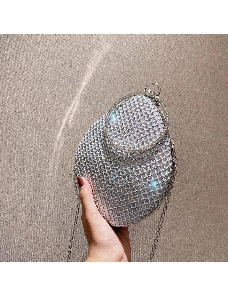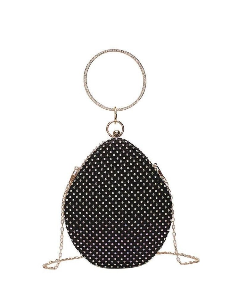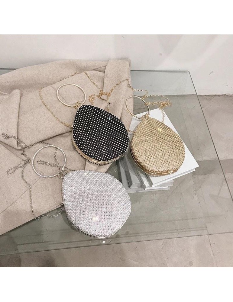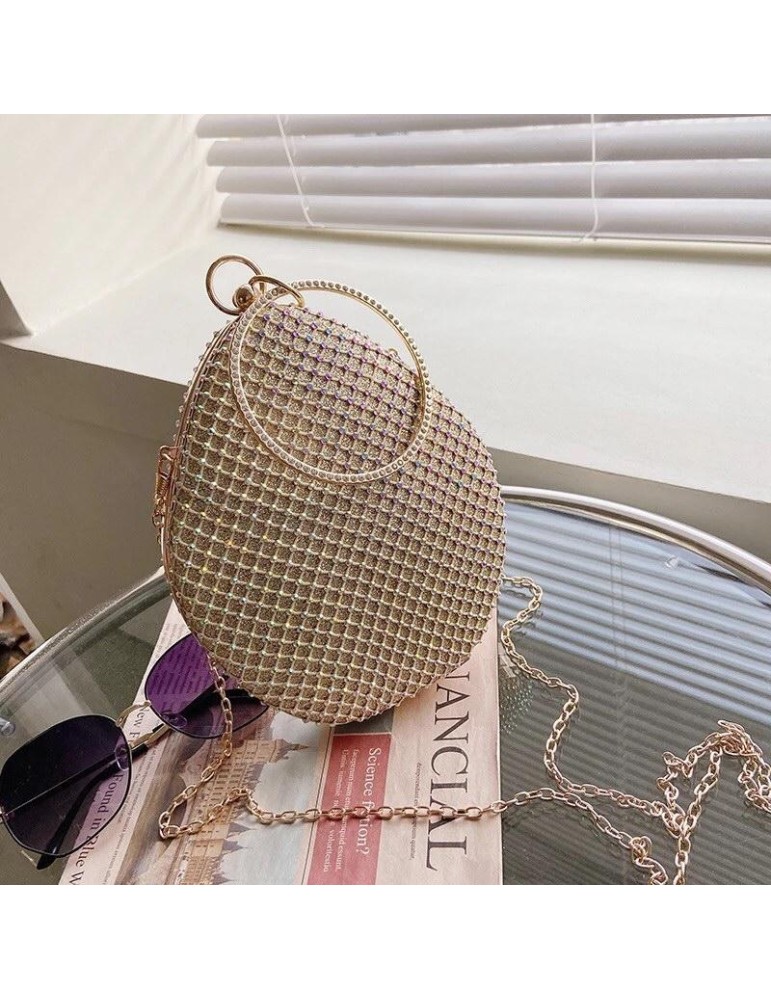 Oval shape purse with round handle and rhinestone details.